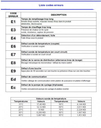Je rencontre un soucis avec mon lave-vaisselle Valberg 14s42cxad929c, il réalise environ deux tiers de son cycle et s'arrête avec le code E3. Malheureusement sur le manuel, il ne parle que du code E1, E4 et E8. En ayant parcouru un peu les forums, il semblerait que celui puisse venir soit d'un problème d'évacuation, soit un problème de chauffe. L'eau s'évacue très bien, j'ai contrôlé la résistance de chauffage, elle est à 28 ohms et la sonde de température est à 18 ohms. J'ai tout de même démonté la résistance pour la brancher directement en 220V, celle-ci chauffe très bien et très rapidement.